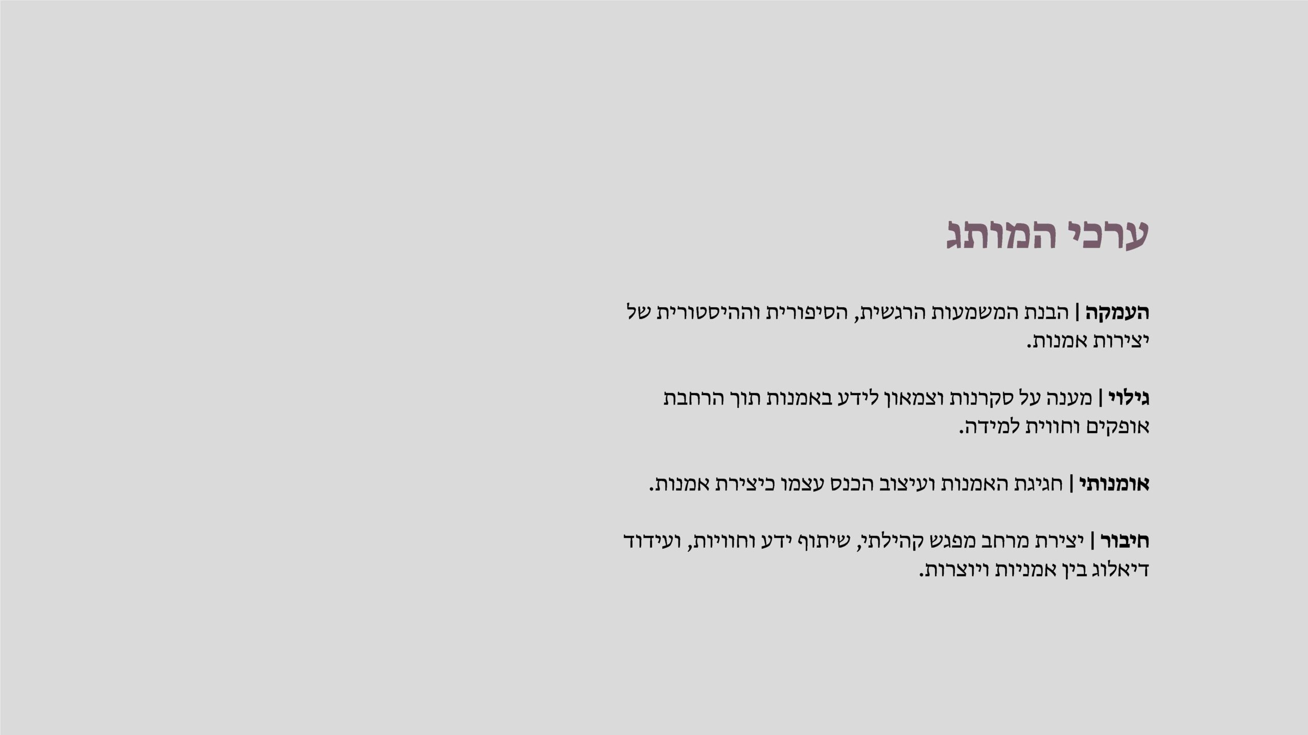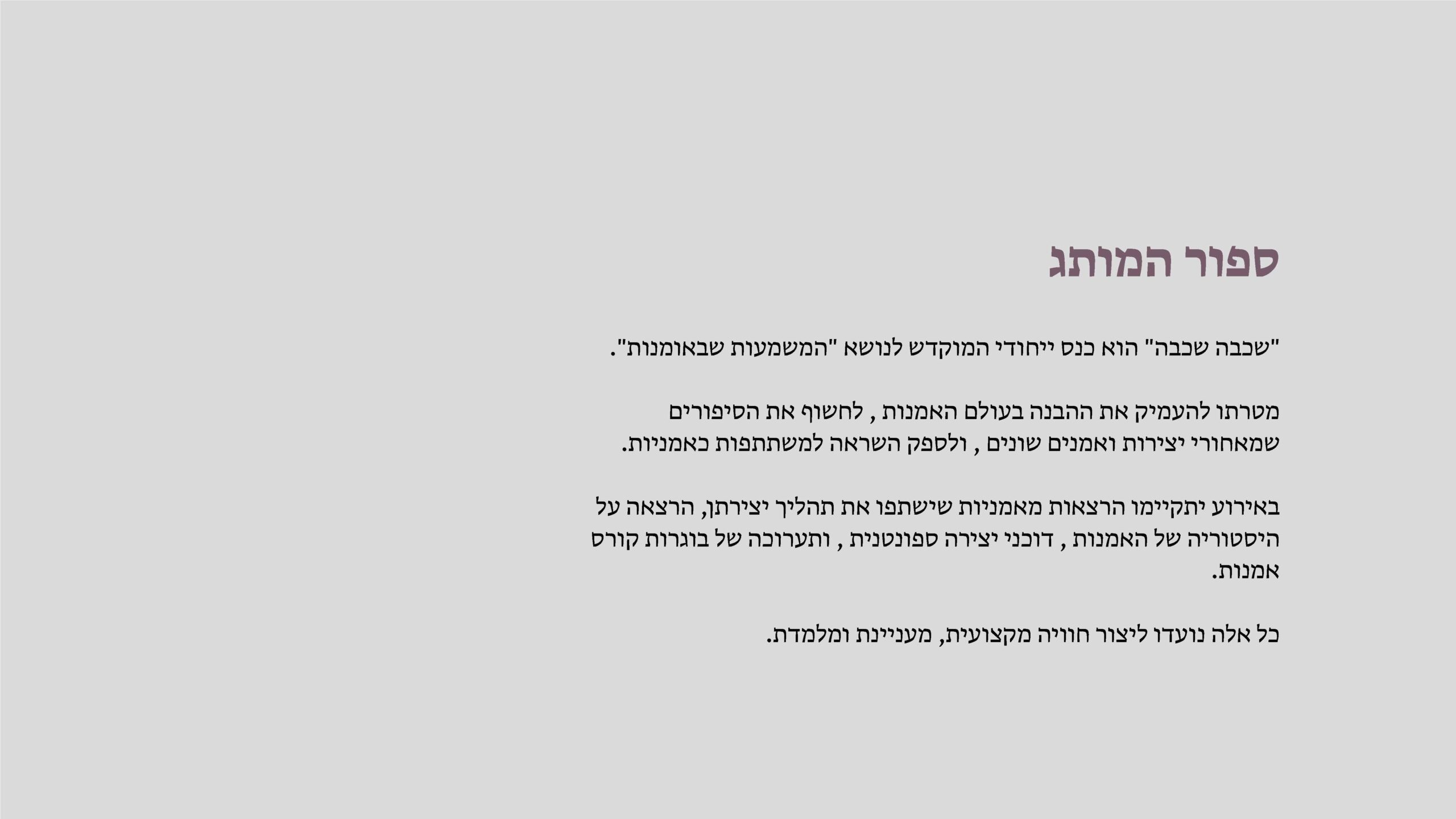 מטרתו להעמיק את ההבנה בעולם האמנות , לחשוף את הסיפורים שמאחורי יצירות ואמנים שונים , ולספק השראה למשתתפות כאמניות.