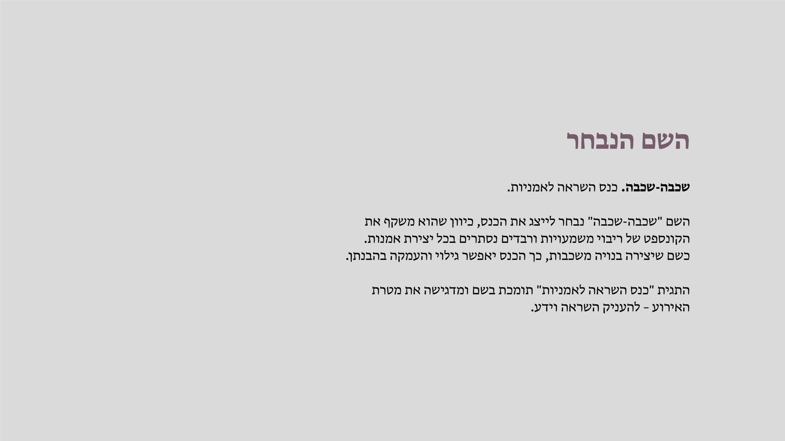 השם "שכבה-שכבה" נבחר לייצג את הכנס, כיוון שהוא משקף את הקונספט של ריבוי משמעויות ורבדים נסתרים בכל יצירת אמנות. כשם שיצירה בנויה משכבות, כך הכנס יאפשר גילוי והעמקה בהבנתן.